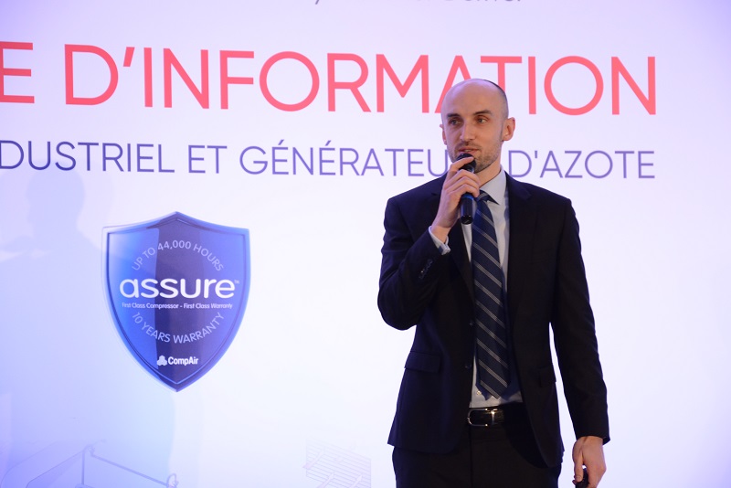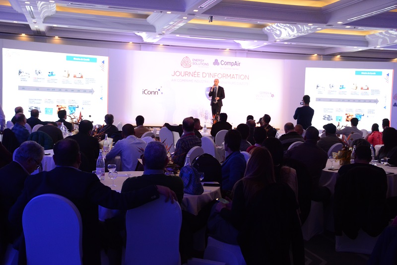 Après la présentation de CompAir par Loic Mazet (sales director), les autres hauts responsables se relayent pour révéler les nouveautés. Il s’agit des “compresseurs à vis lubrifiées à vitesse fixe et à vitesse variable” (Saber Trabelsi-North Africa sales manager); “les compresseurs oil free de classe O” (Jean Luc Amsellem–oil free sales manager); “les sécheurs frigorifiques et à adsorption” et “les opportunités énergétiques et maîtrise des coûts de maintenance” (Sofiane Djebari–Export sales manager); “les générateurs d’azote”, “le programme Assure de l’extension de la garantie jusqu’à 10 ans ” et “la surveillance technique à distance industrie 4.0: ICONN”(Cyrille Lebosse–aftermarket sales manager).