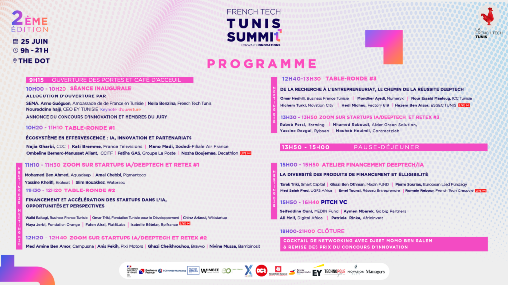 La French Tech Tunis place l’écosystème tunisien au centre de l’actualité Deeptech et IA les 25, 27 et 28 juin 2025. À l’occasion de la 2ᵉ édition du French Tech Tunis Summit, organisée le 25 juin à The DOT (Lac 2 – Tunis), l’événement réunira des acteurs clés de l’innovation de rupture et de l’entrepreneuriat technologique à impact. Axée sur la Deeptech et l’intelligence artificielle, cette édition entend connecter les pionniers des deux rives pour faciliter l’émergence des solutions de demain.