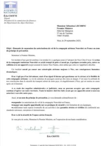 Le député français Éric Ciotti, président de la commission des finances de l’Assemblée nationale, a adressé lundi 29 septembre 2025 une lettre au Premier ministre français Sébastien Lecornu, demandant la suspension des vols de la compagnie tunisienne Nouvelair en France. Il invoque le principe de précaution, estimant que l’incident survenu le 21 septembre à l’aéroport de Nice Côte d’Azur remet en cause «la fiabilité et le sérieux» de la compagnie.
