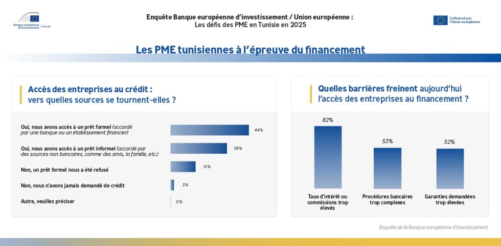 Dans le cadre du Trade and Competitiveness Programme et afin de mieux cerner les enjeux liés à l’accès au financement en Tunisie, la Banque européenne d’investissement (BEI) dévoile le second volet de son enquête « Enquête BEI / UE : Les défis des PME en Tunisie en 2025 ». Réalisée auprès de 150 dirigeants de PME tunisiennes issues des chaînes de valeur stratégiques telles que l’industrie automobile, l’agroalimentaire ou le textile, cette enquête met en lumière une réalité parlante : plus d’une PME sur deux ne parvient toujours pas à accéder à un financement formel.