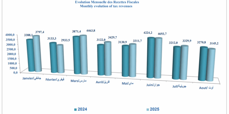 À fin août 2025, le cumul des recettes fiscales s’élève à 29 104,9 millions de dinars, soit une augmentation de 6,4 % par rapport à la même période en 2024. Ce rythme est inférieur à celui observé l’an dernier, où les recettes avaient progressé de 9,9 %, soulignant un léger ralentissement dans la collecte fiscale. Les recettes fiscales constituent la majeure partie des ressources budgétaires, qui totalisent 31 639,4 millions de dinars à fin août 2025, contribuant à une croissance globale des recettes de 5,6 %.