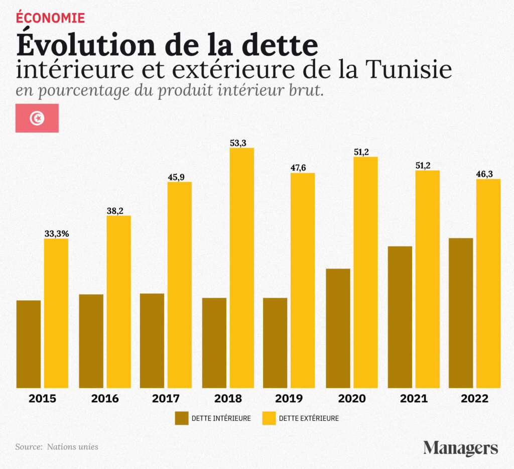 En ce qui concerne la Tunisie, elle figure parmi les pays les plus exposés à la montée de la dette. D’après l’ECA, le ratio dette publique/PIB est passé de 67,3% en 2019 à 83,7% en 2024. Plus de la moitié de cette dette est désormais contractée à l’intérieur du pays. En 2015, la dette extérieure représentait 51,23% du PIB contre 33,29% pour la dette intérieure. En 2022, la tendance s’est inversée: la dette intérieure (48,36%) a dépassé la dette extérieure (46,32%).