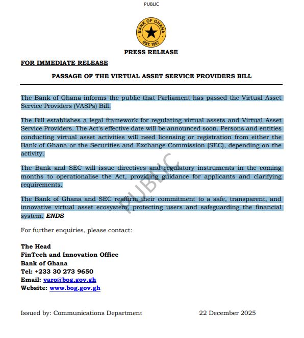 Le Ghana franchit une étape majeure dans la régulation des cryptomonnaies avec l’adoption par son Parlement de la loi Virtual Asset Service Providers (VASP).