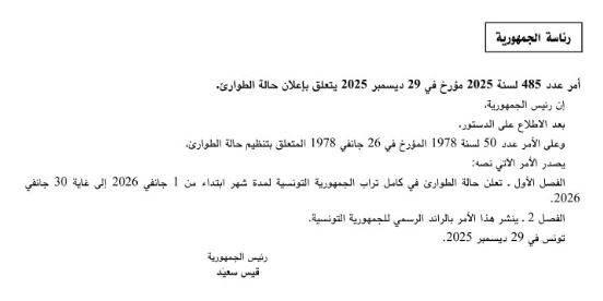 Le décret n°485 du 29 décembre 2025, publié au Journal officiel, prolonge l’état d’urgence sur tout le territoire tunisien du 1ᵉʳ au 30 janvier 2026.