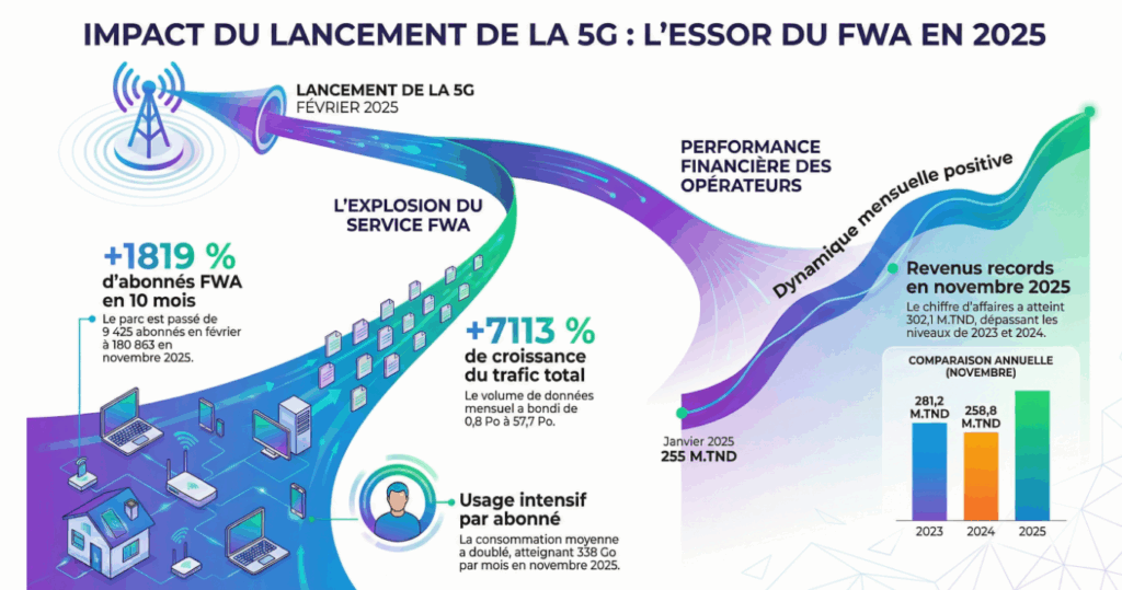 Intitulé «KPI Clés Post Lancement de la 5G», ce rapport synthétise les principaux indicateurs de performance (KPI) du secteur des télécommunications à la suite du lancement de la 5G, basé sur les données de l’Observatoire de l’Instance nationale des télécommunications (INT) arrêtées à novembre 2025.