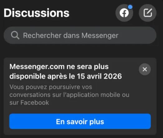 Depuis fin 2025, Meta avait déjà retiré les applications Messenger pour Mac et Windows. La version web suivra donc le même chemin. Après avril, les utilisateurs qui voudront accéder à leurs messages depuis un ordinateur devront passer par facebook.com/messages.