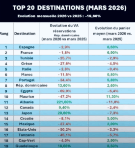 Le mois de mars 2026 est difficile pour le tourisme. Les réservations de voyages reculent de 19,6% en France par rapport à mars 2025. Cause principale: la guerre au Moyen-Orient. Elle inquiète les voyageurs. Elle perturbe les vols. Elle fait fuir les clients de nombreuses destinations.